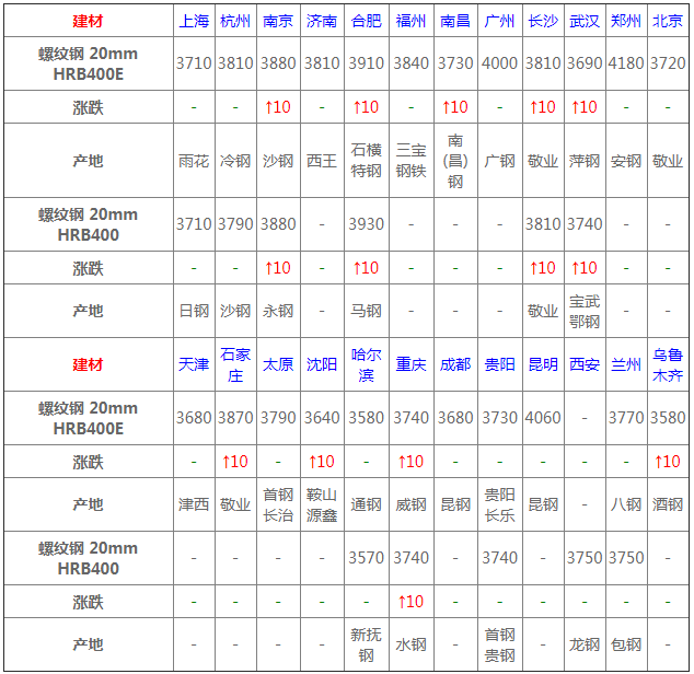螺紋鋼24個市場中9個市場上漲10,20mmHRB400E平均價格3792元/噸,較上個交易日上調(diào)4元/噸。