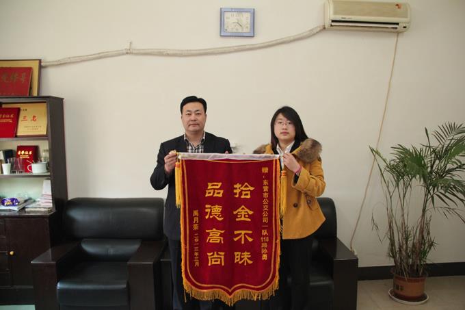 4月9日上午,康源律師事務所的禹月榮女士拿著一面寫有“拾金不昧、品德高尚”的錦旗來到市公交公司汽車一隊,感謝車隊駕駛員孫勇師傅的高尚品德。據車隊了解得知,4月4日,禹月榮女士乘坐孫勇師傅駕駛的118路去上班,上班以后發現裝有重要文件的拎包不見了,她心急如焚,當時就癱坐在地上,因為包里面裝有五個檔案袋,卷中裝有重要的訴訟材料,其中很多資料無法彌補,后果不堪設想。