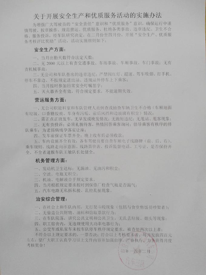 為增強廣大駕駛員的“安全責任”意識和“優質服務”意識,促使駕駛員出車前做好車輛檢查和衛生保潔,運行中謹慎駕駛、優質服務,收車后規范停車,減少各類違章違紀、服務投訴和行車事故,杜絕單車衛生不合格和不收款現象發生,實現職工薪金跨年度平穩過渡,市公交公司汽車三隊充分利用部分工資結余,發揮經濟杠桿作用,自2014年2月份起制定實施了“安全生產和優質服務考評獎勵辦法”。