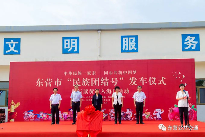 5月24日上午9時,東營市民族團結號發車儀式在市公交公司隆重舉行。市委常委、統戰部部長郭艷出席儀式并作講話,市人大常委會副主任張敏,市政協副主席王新明,市委統戰部副部長、市民宗局局長王燕,市交通運輸局黨組成員、市鐵路港航發展中心主任朱勝勇,市公交公司黨委書記趙龍等領導同志參加發車儀式。